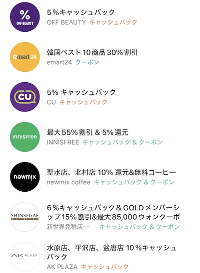 スクールフード/ヨアジョン/メガコーヒー/ゴンチャ/トゥーサムプレイス/マムズタッチ/香港飯店/魔王チョッパル/ウォンハルモニポッサム/ガジャンマシンヌンチョッパル/KFC/バーガーキング/ジョーズトッポッキ/シンジョントッポッキ/サダキンパ/KyoChonチキン/BBQチキン/BHCチキン/ネネチキン/グッネチキン/ボベ飯店 etc…(時期や地域によって異なることがあります)