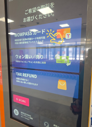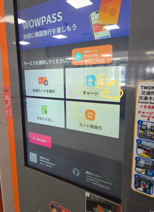WOWPASS機械では、「カードの発行」「チャージ」「ウォン現金引き出し」「カード再発行」が可能です。