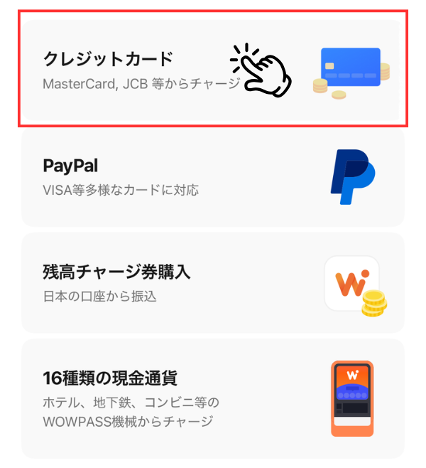 WOWPASSにチャージする場合は「WOWPASSカード」を選択します。